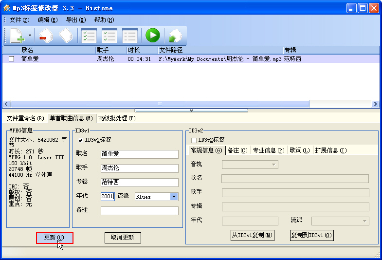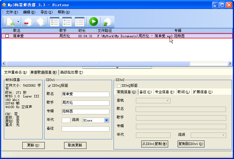 修改Mp3文件的ID3标签当您发现您的Mp3文件在您的手机或者播放器中歌名歌手名错误时,您就需要通过Mp3标签修改器修改之。 请按照如下步骤操作:(文件名是“周杰伦 - 简单爱.mp3”为例) 1)单击“添加文件” 按钮将“周杰伦 - 简单爱.mp3”添加到软件中,如图一所示: 图一 添加文件(点击看大图) 2)单击选中您添加到软件中的歌曲,如图二所示: 图二 选中歌曲(点击看大图) 3)歌名修改为“简单爱”,歌手修改为“周杰伦”,专辑修改为“范特西”,年代修改为“2001”,然后点击更新按钮,如图三所示 图三 修改ID3v1标签(点击看大图) 4)您就可以从上面列表中看到,已经修改成功的ID3v1标签了,如图四所示: 图四 Mp3标签修改成功(点击看大图) 5)您有其他问题请返回到在线帮助主页。 有任何问题请联系:china@bistonesoft.com